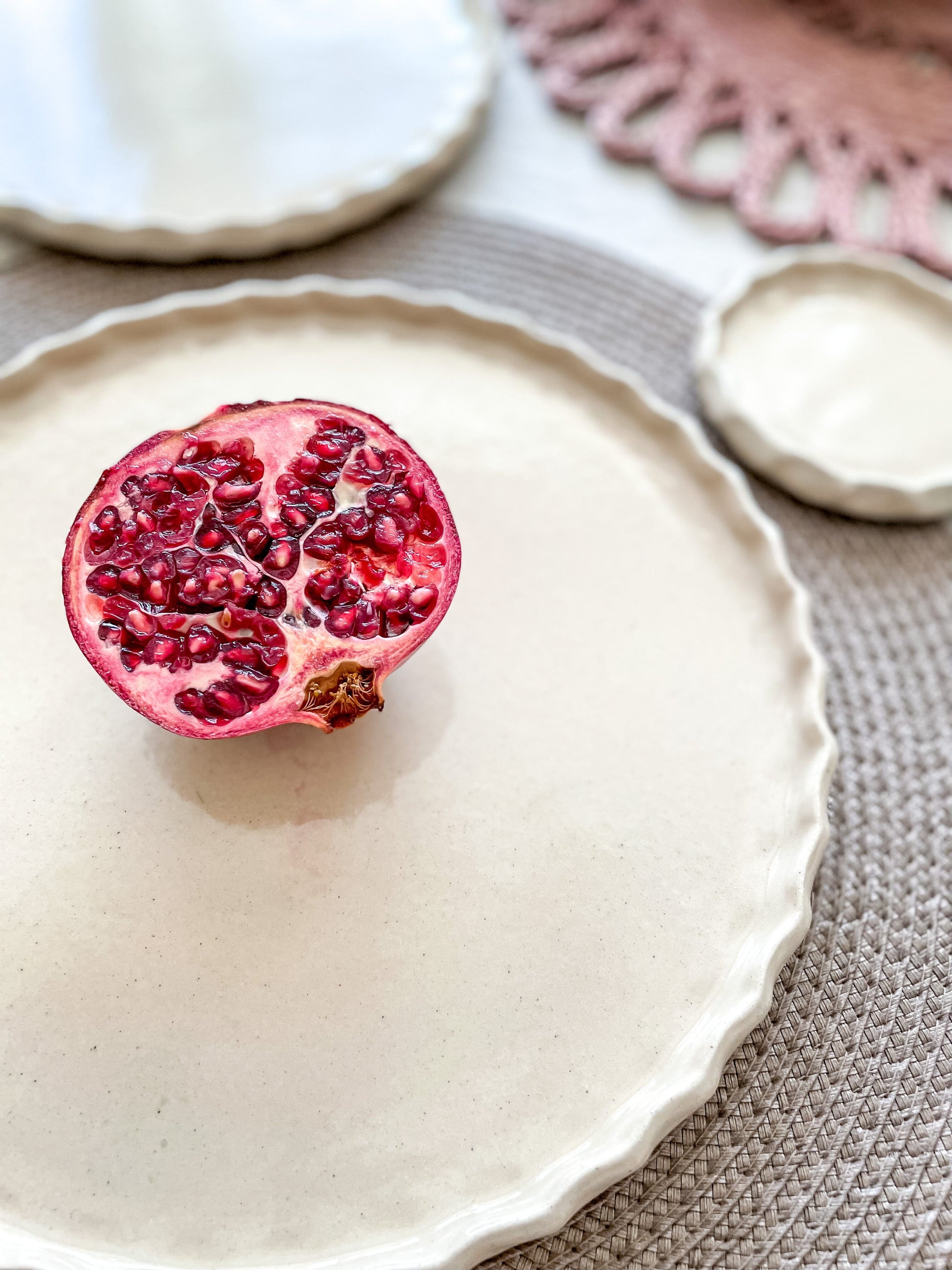 هذا الطبق مصنوع يدويًا من الخزف الحجري المرقط قليلاً، والحافة مضغوطة بحركة منتظمة في كل مكان لخلق حافة للوحة ذات جمالية فريدة. الطبق مزجج بشفاف لامع ومتوفر بثلاثة أحجام مختلفة: أطباق العشاء، وطبق المدخل، وطبق جانبي/حلوى.